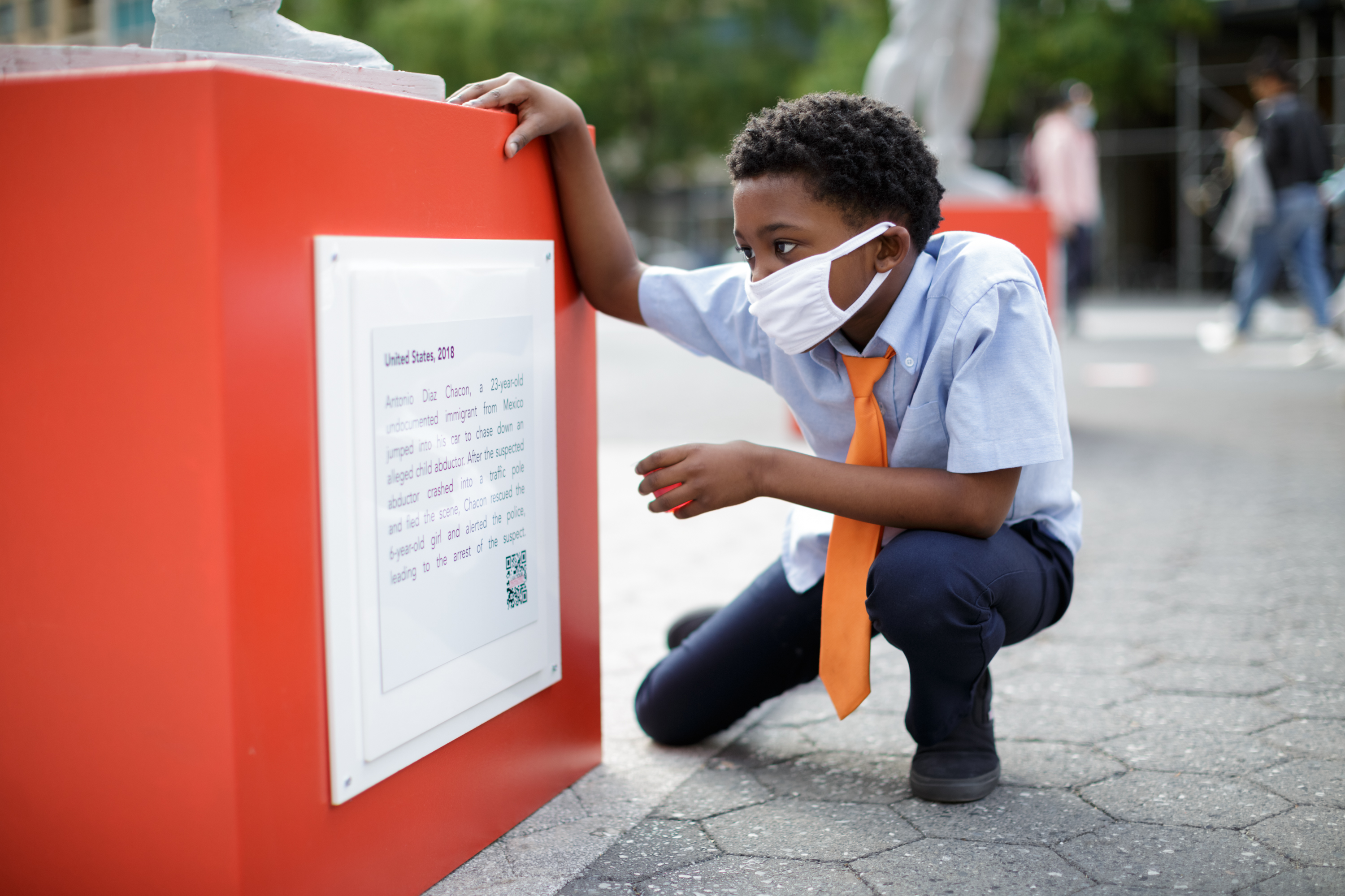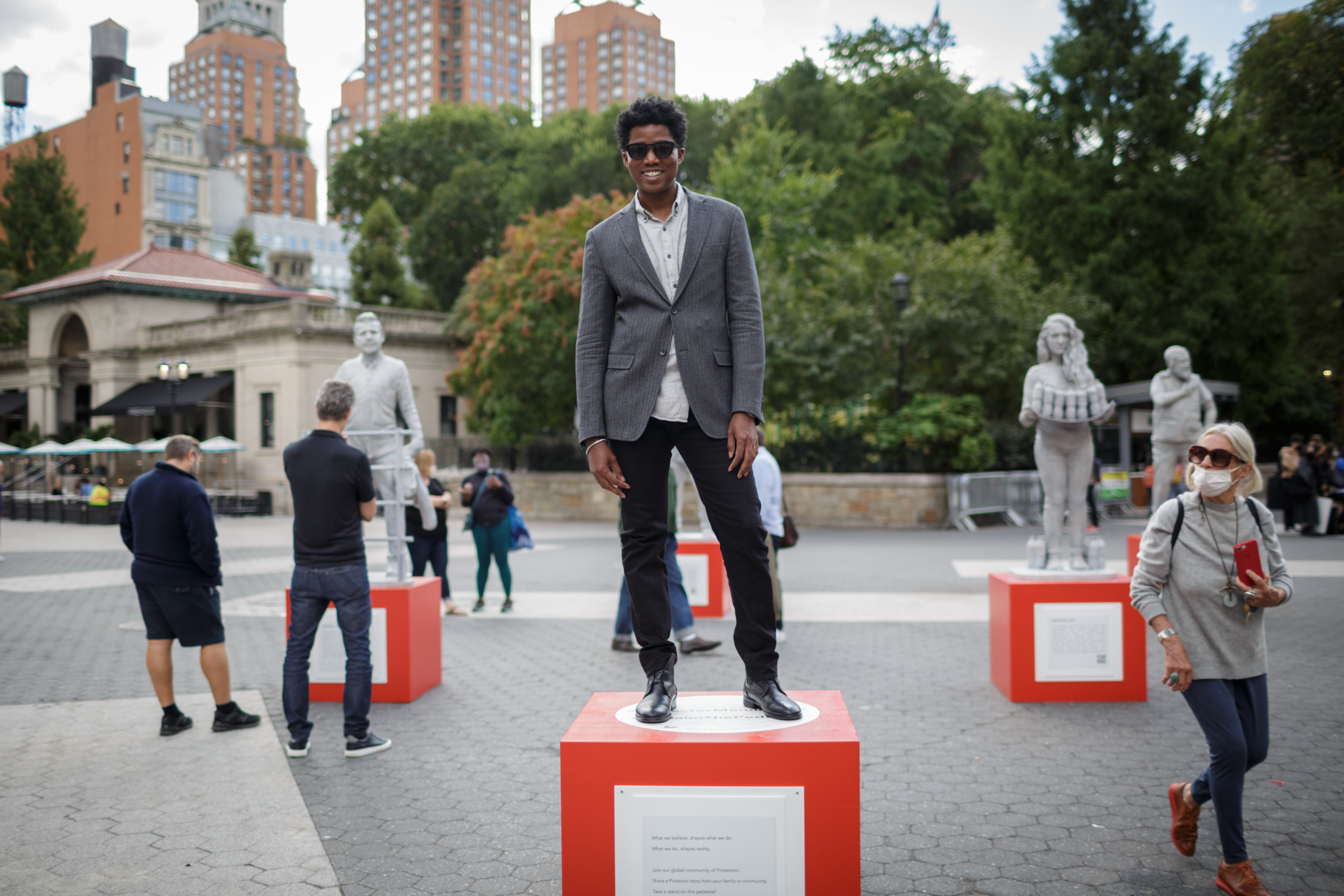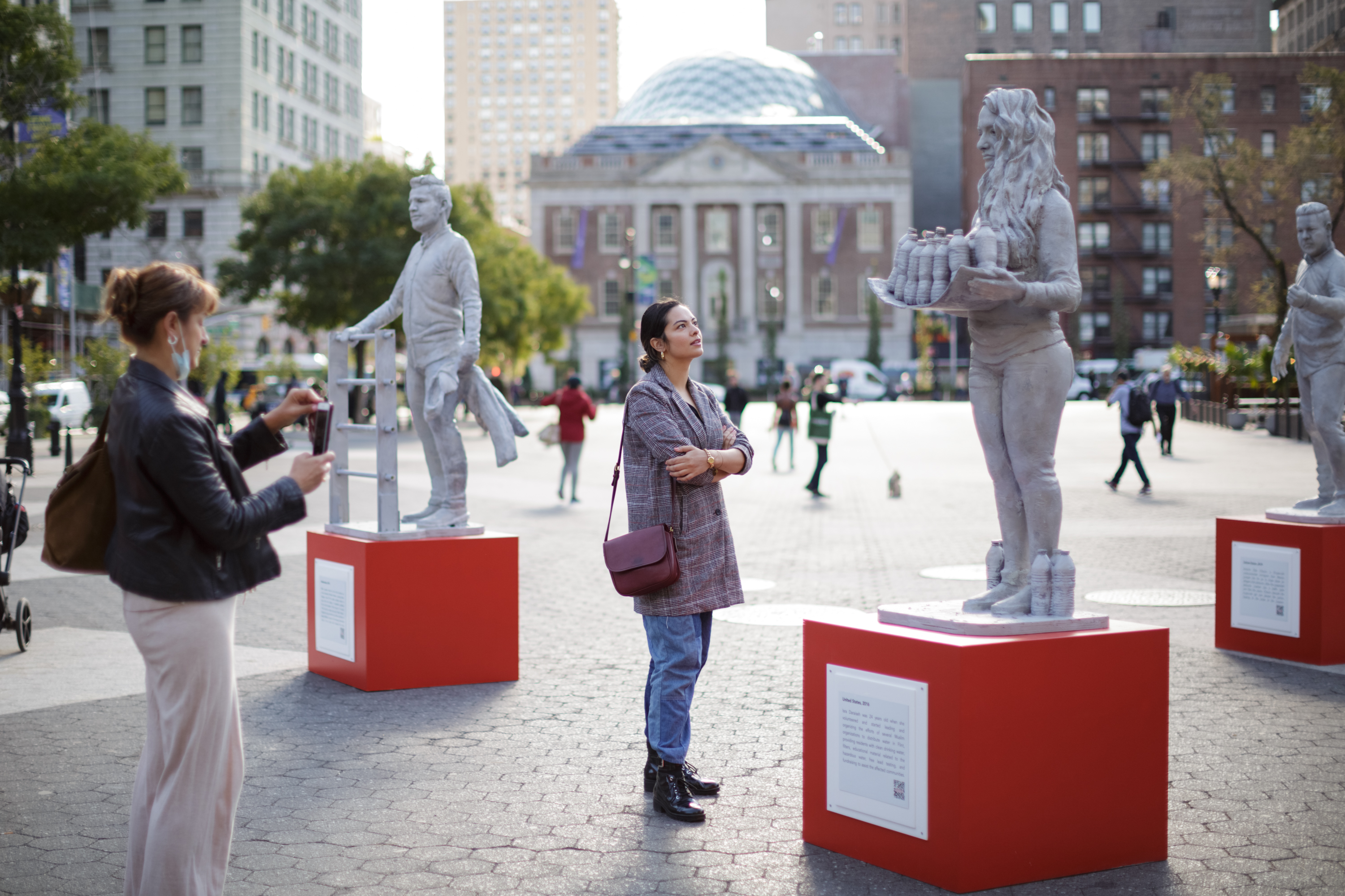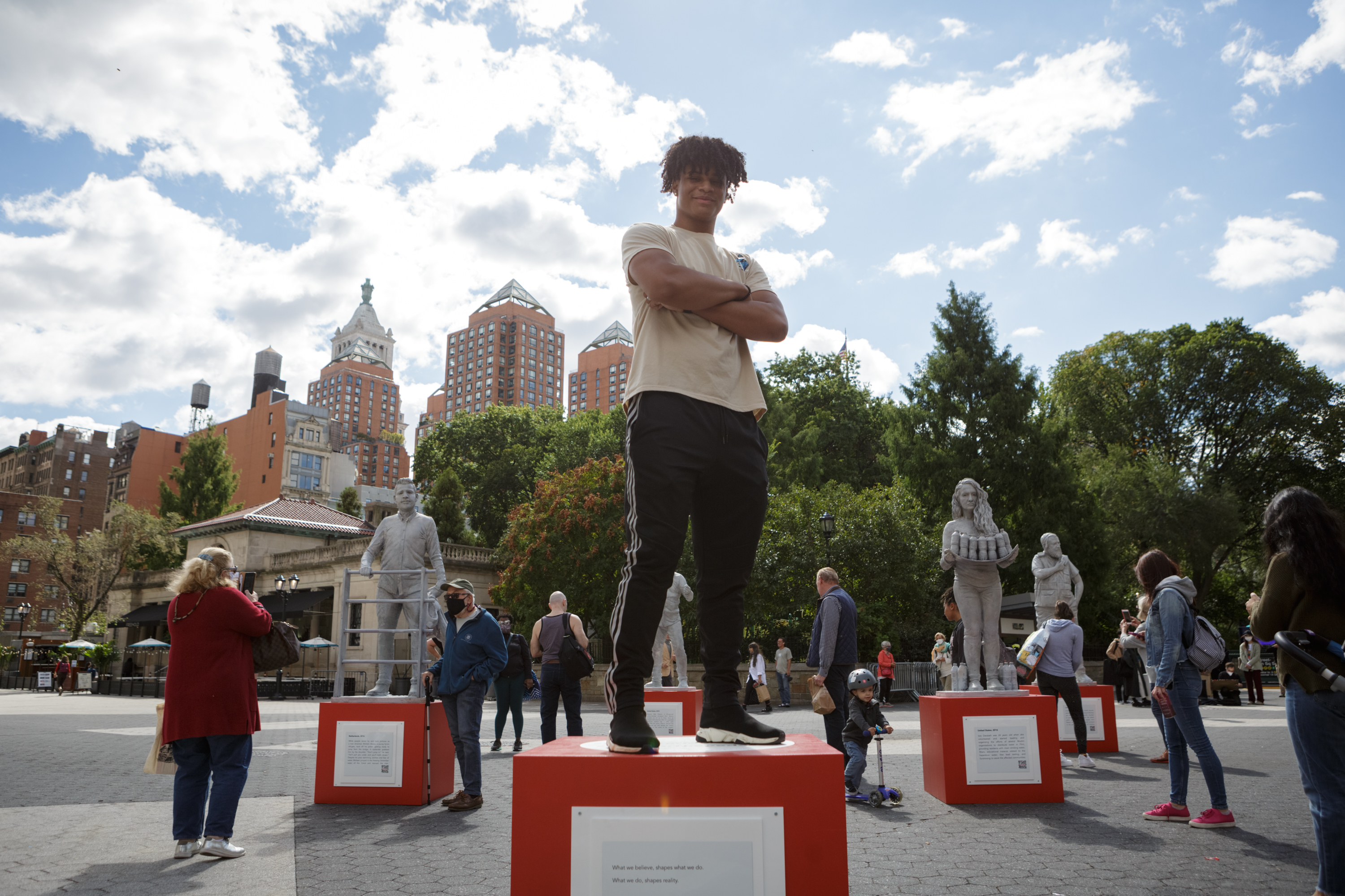 These five “Protector monuments” reclaim the public space for all of us—people of color, minorities, refugees, immigrants and women. The monuments are on pedestals to celebrate and elevate them as individuals we can collectively look up to.